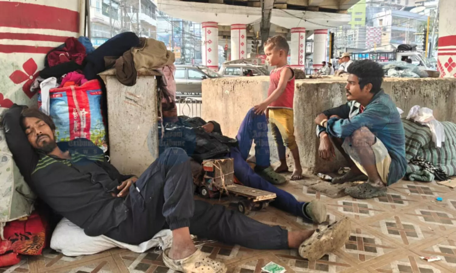 With their belongings stacked beside them, street-side residents sit under Ulubari flyover in the city (Photo: AT)